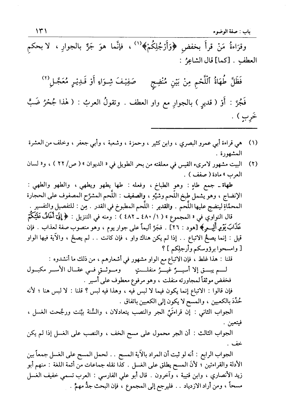 وقراءة من قرأ بخفض (وأرجلكم) ، فإنما هو جر بالجوار، لا بحكم العطف. [كما] قال الشاعر:
