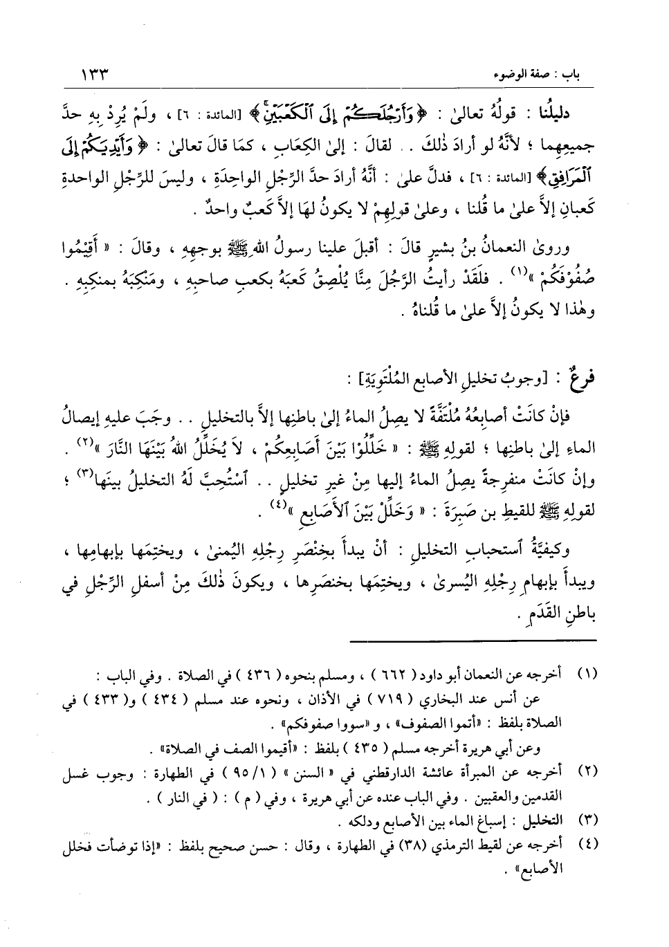 وروى النعمان بن بشير قال: «أقبل علينا رسول الله - صَلَّى اللَّهُ عَلَيْهِ وَسَلَّمَ - بوجهه، وقال: " أقيموا صفوفكم ". فلقد رأيت الرجل منا يلصق كعبه بكعب صاحبه، ومنكبه بمنكبه» . وهذا لا يكون إلا على ما قلناه.
