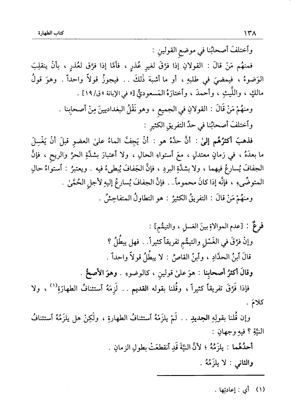 فمنهم من قال: القولان إذا فرق لغير عذر، فأما إذا فرق لعذر، بأن ينقلب الوضوء، فيمضي في طلبه، أو ما أشبه ذلك، فيجوز قولا واحدًا. وهو قول مالك، والليث، وأحمد، واختاره المسعودي [" في الإبانة " ق\19] .