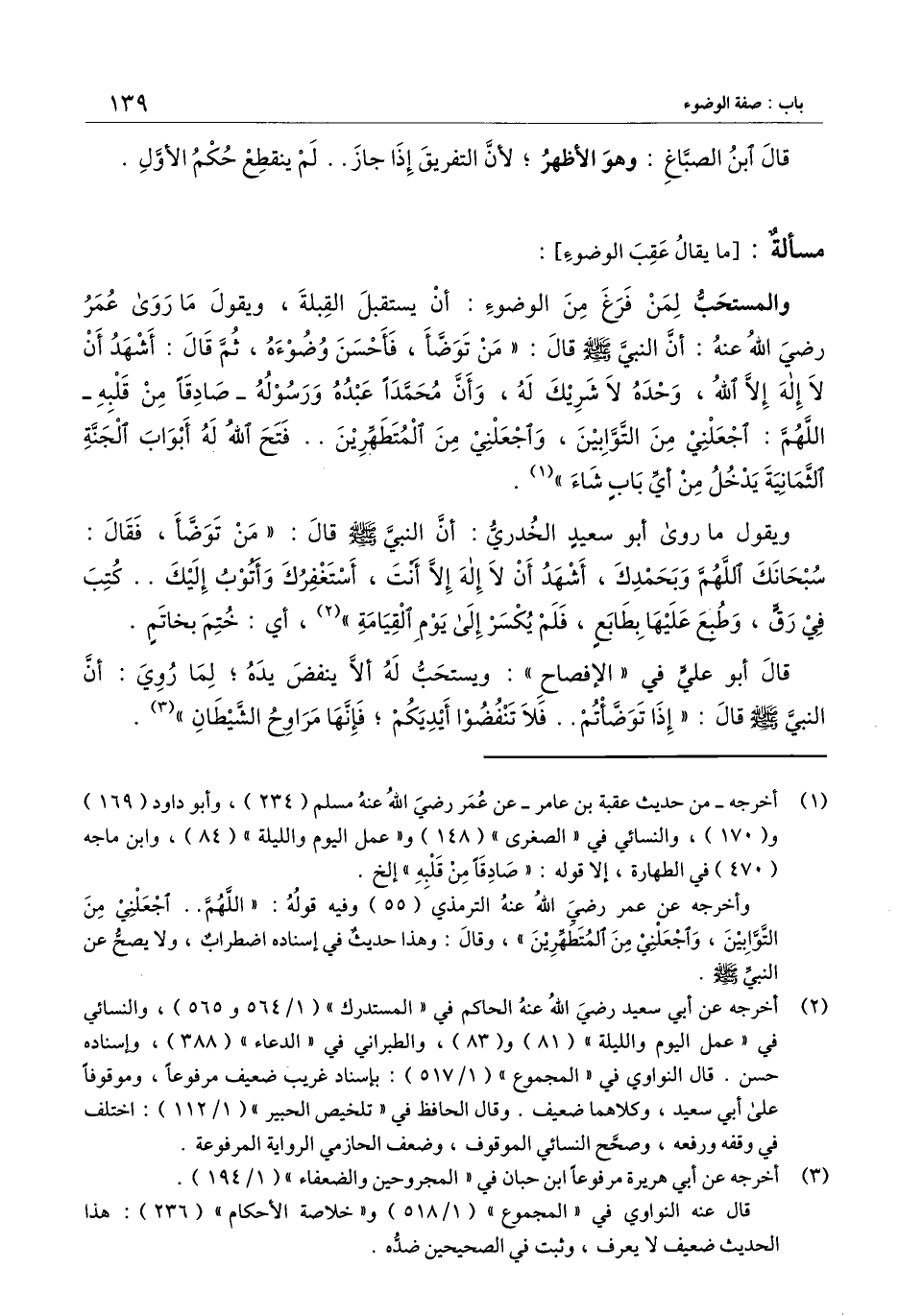 ] : والمستحب: لمن فرغ من الوضوء: أن يستقبل القبلة، ويقول ما روى عمر - رَضِيَ اللَّهُ عَنْهُ -: أن النبي - صَلَّى اللَّهُ عَلَيْهِ وَسَلَّمَ - قال: «من توضأ، فأحسن وضوءه، ثم قال: أشهد أن لا إله إلا الله، وحده لا شريك له، وأن محمدًا عبده ورسوله ـ صادقًا من قلبه ـ اللهم اجعلني من التوابين، واجعلني من المتطهرين، فتح الله له أبواب الجنة الثمانية يدخل من أي باب شاء» .