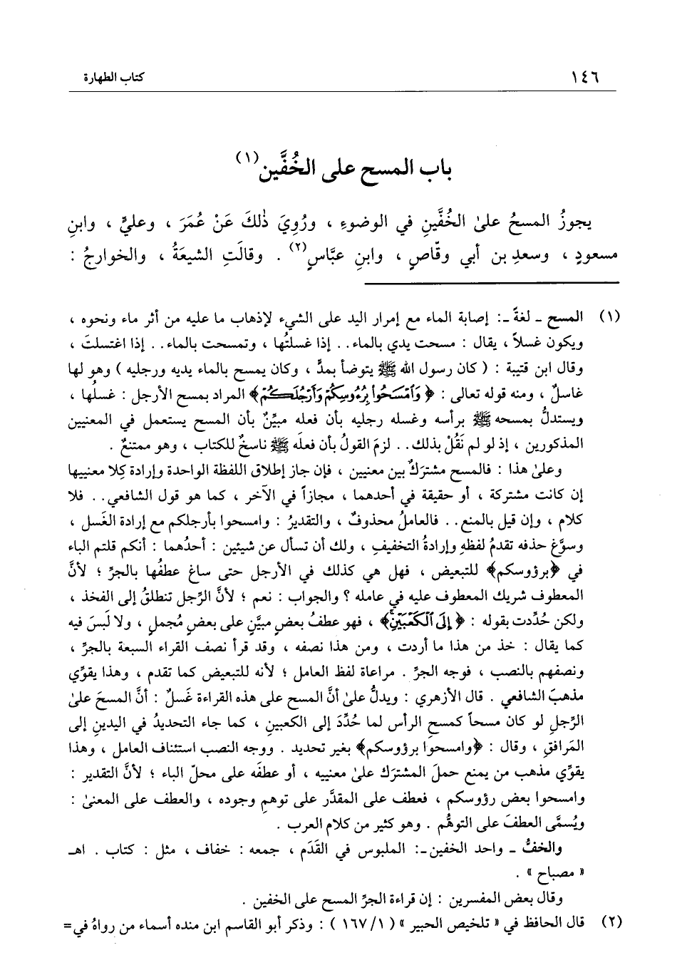 يجوز المسح على الخفين في الوضوء، وروي ذلك عن عمر، وعلي، وابن مسعود، وسعد بن أبي وقاص، وابن عباس، وقالت الشيعة، والخوارج: