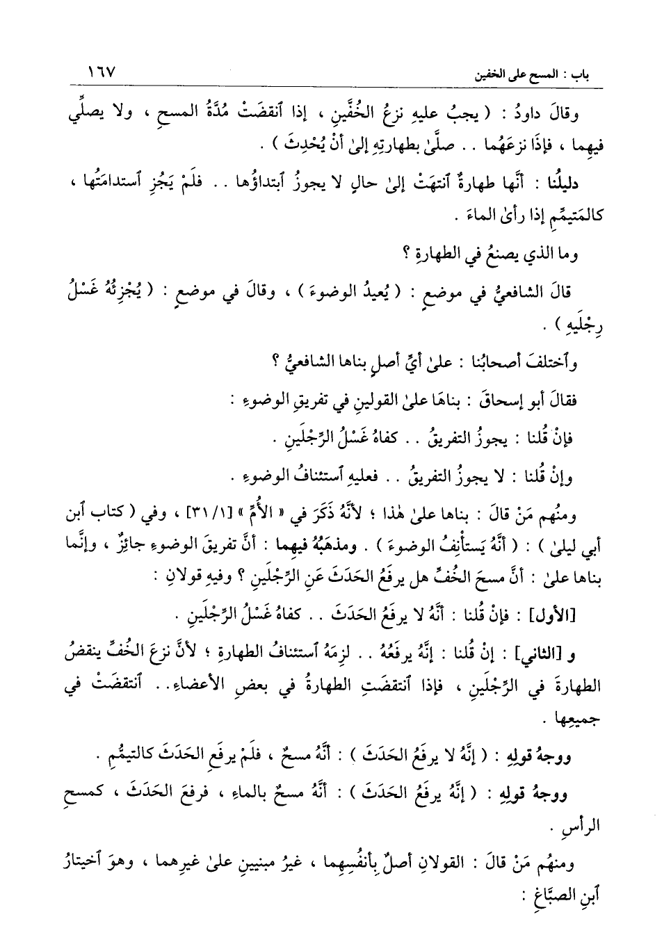 ومنهم من قال: بناها على هذا، لأنه ذكر في " الأم " [1/31] ، وفي (كتاب ابن أبي ليلى) : (أنه يستأنف الوضوء) . ومذهبه فيهما: أن تفريق الوضوء جائز، وإنما بناها على أن مسح الخف هل يرفع الحدث عن الرجلين؟ وفيه قولان: