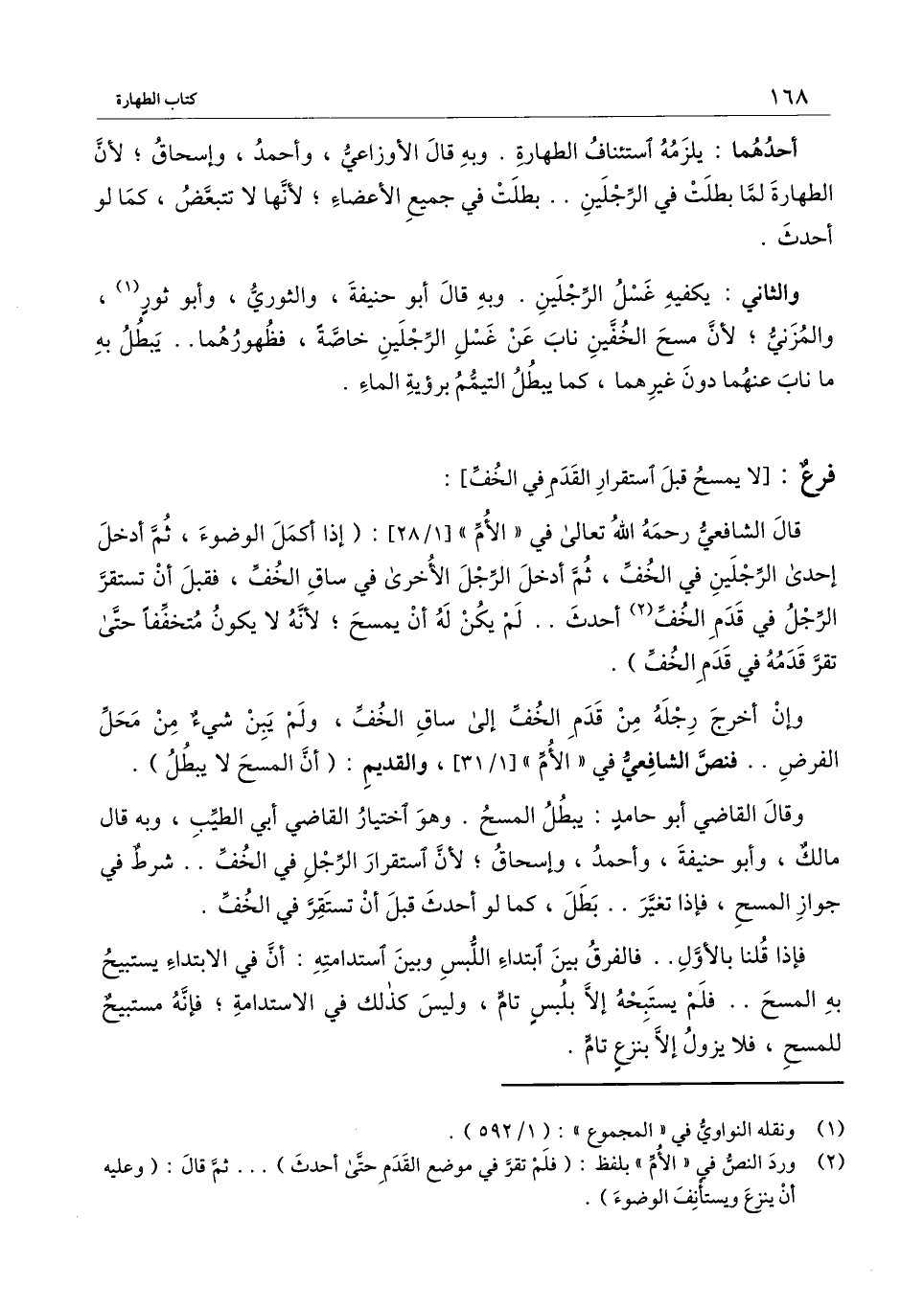 ] : قال الشافعي - رَحِمَهُ اللَّهُ تَعَالَى - في " الأم " [1/28] : (إذا أكمل الوضوء، ثم أدخل إحدى الرجلين في الخف، ثم أدخل الرجل الأخرى في ساق الخف، فقبل أن تستقر الرجل في قدم الخف أحدث، لم يكن له أن يمسح، لأنه لا يكون متخففًا حتى تقر قدمه في قدم الخف) .