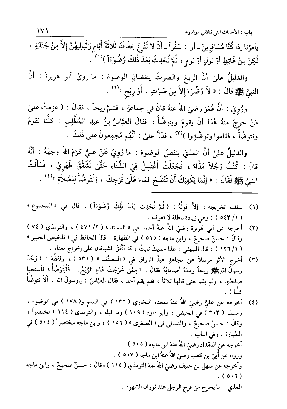 والدليل على أن المذي ينقض الوضوء: ما روي «عن علي كرم الله وجهه: أنه قال: كنت رجلا مذاءً، فجعلت أغتسل في الشتاء حتى تشقق ظهري، فسألت النبي - صَلَّى اللَّهُ عَلَيْهِ وَسَلَّمَ - فقال: " إنما يكفيك أن تنضح الماء على فرجك، وتتوضأ للصلاة» .