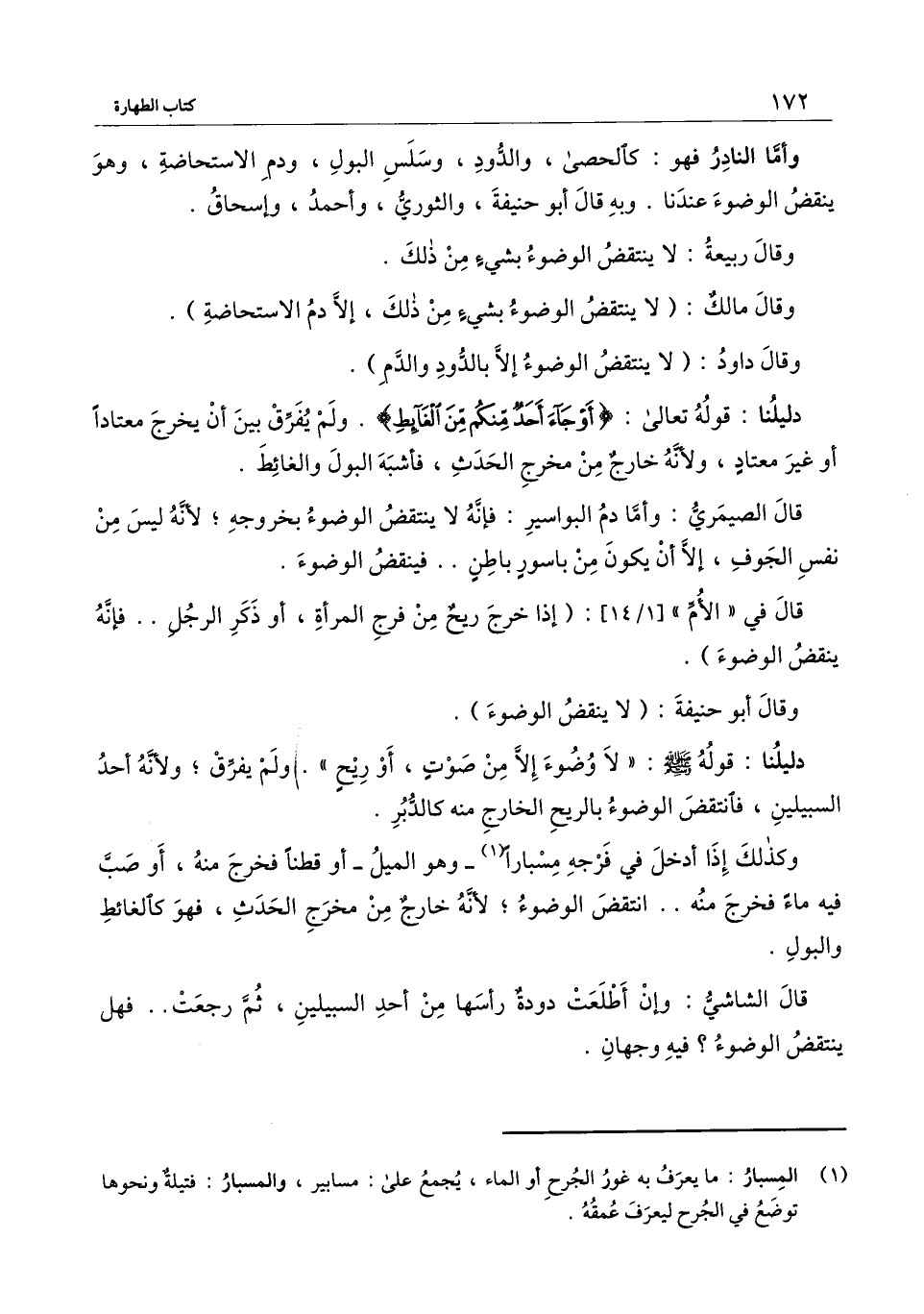 وأما النادر فهو: كالحصى، والدود، وسلس البول، ودم الاستحاضة، وهو ينقض الوضوء عندنا، وبه قال أبو حنيفة، والثوري، وأحمد، وإسحاق.