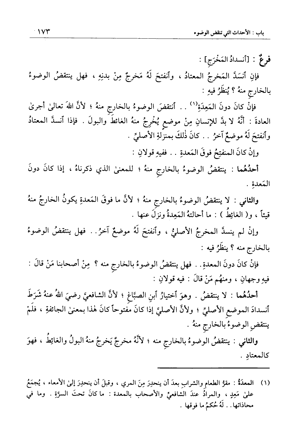 فرع: [انسداد المخرج] : فإن انسد المخرج المعتاد، وانفتح له مخرج من بدنه، فهل ينتقض الوضوء بالخارج منه؟ ينظر فيه: