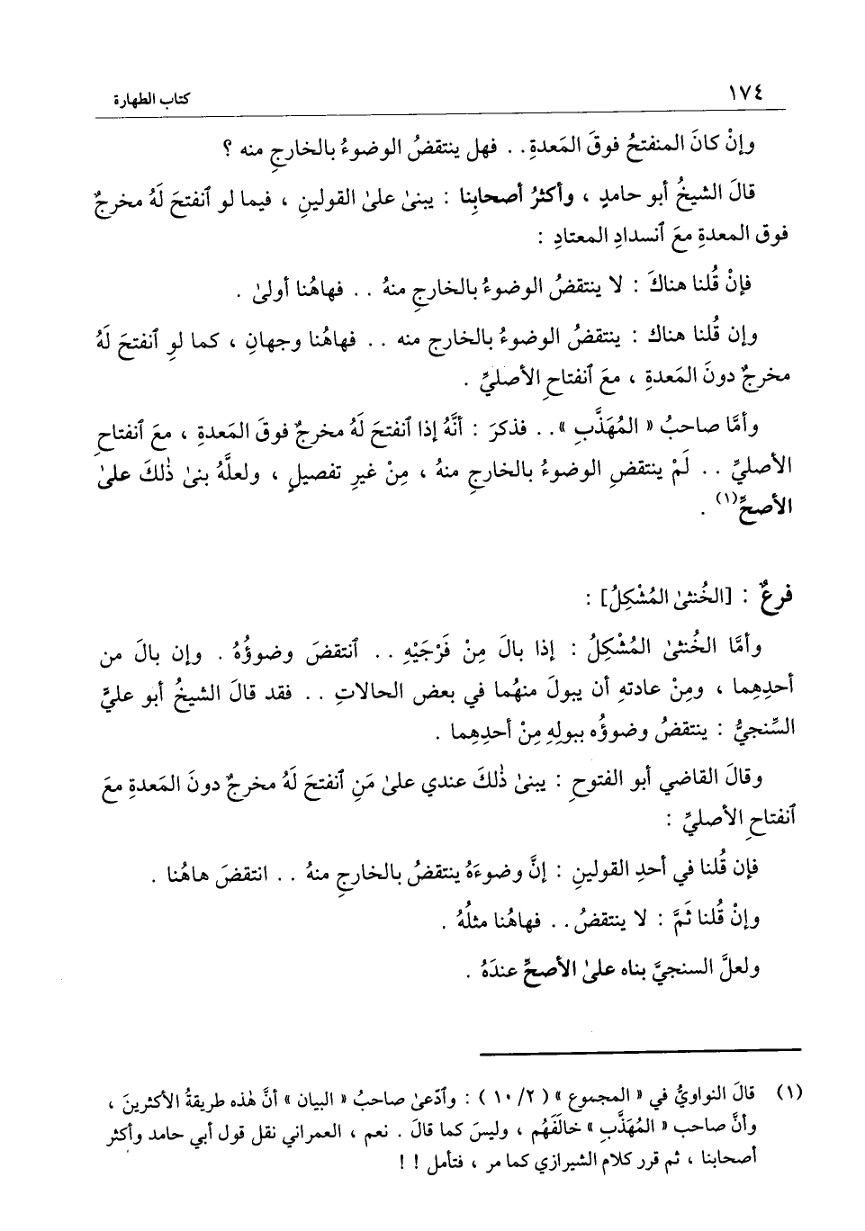 فرع: [الخنثى المشكل] : وأما الخنثى المشكل: إذا بال من فرجيه انتقض وضوؤه. وإن بال من أحدهما، ومن عادته أن يبول منهما في بعض الحالات فقد قال الشيخ أبو علي السنجي: ينتقض وضوؤه ببوله من أحدهما.