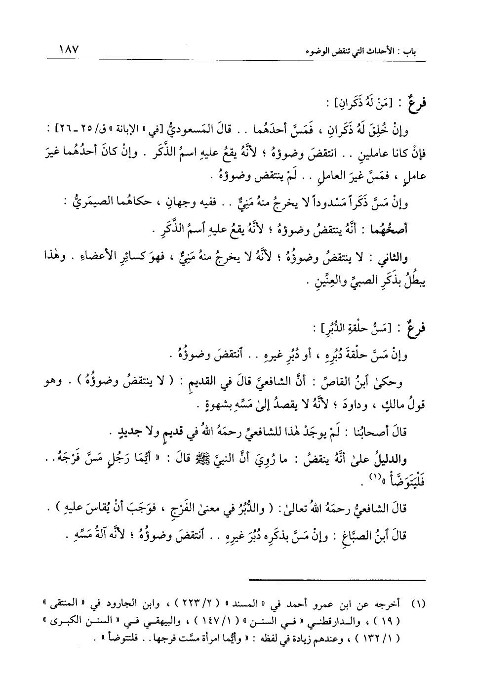 ] : وإن خلق له ذكران، فمس أحدهما قال المسعودي [في " الإبانة " ق\25 ـ 26] : فإن كانا عاملين انتقض وضوؤه؛ لأنه يقع عليه اسم الذكر. وإن كان أحدهما غير عامل، فمس غير العامل لم ينتقض وضوؤه.