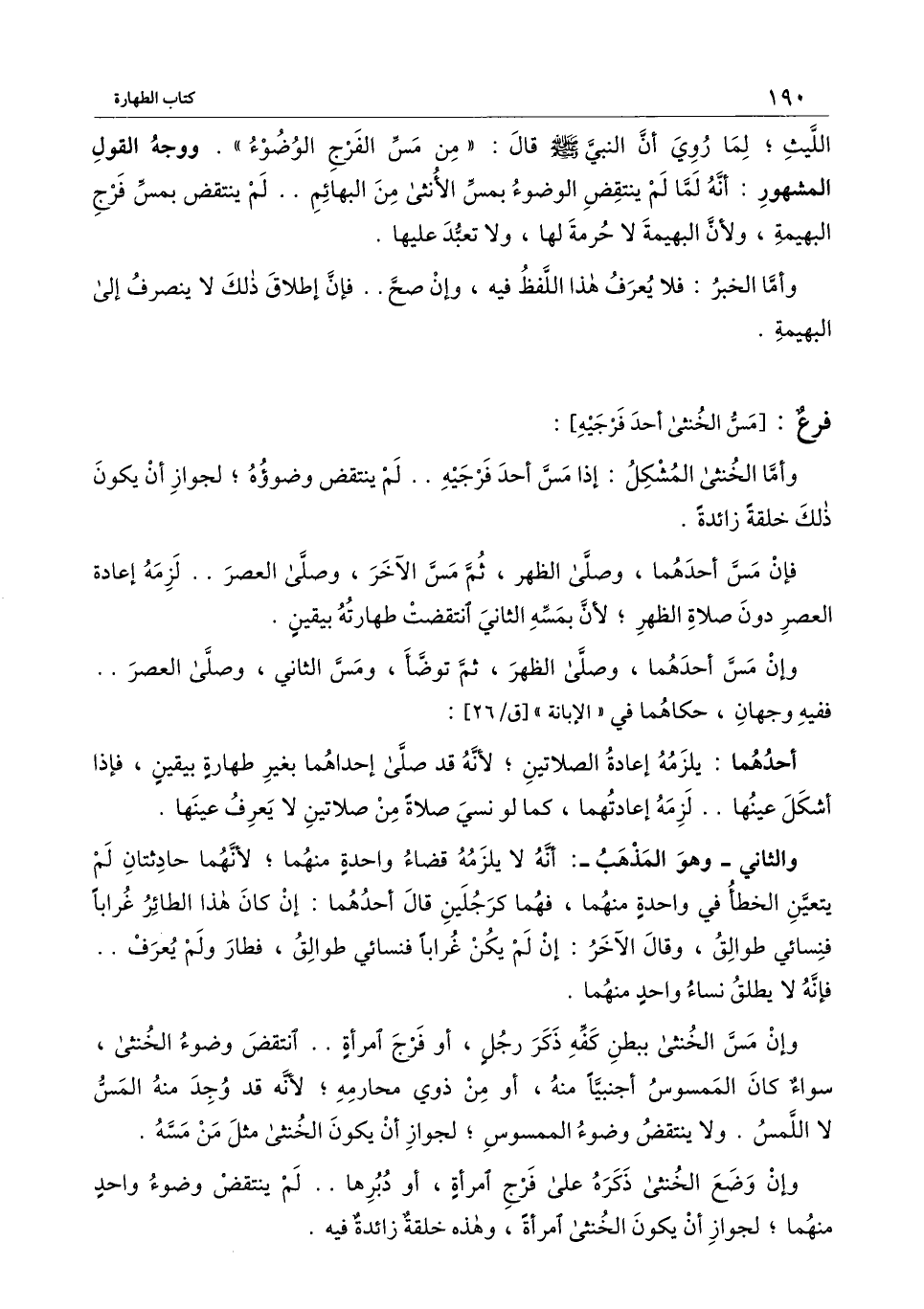 وإن مس الخنثى ببطن كفه ذكر رجل، أو فرج امرأة انتقض وضوء الخنثى، سواء كان الممسوس أجنبيًا منه، أو من ذوي محارمه؛ لأنه قد وجد منه المس لا اللمس. ولا ينتقض وضوء الممسوس؛ لجواز أن يكون الخنثى مثل من مسه.