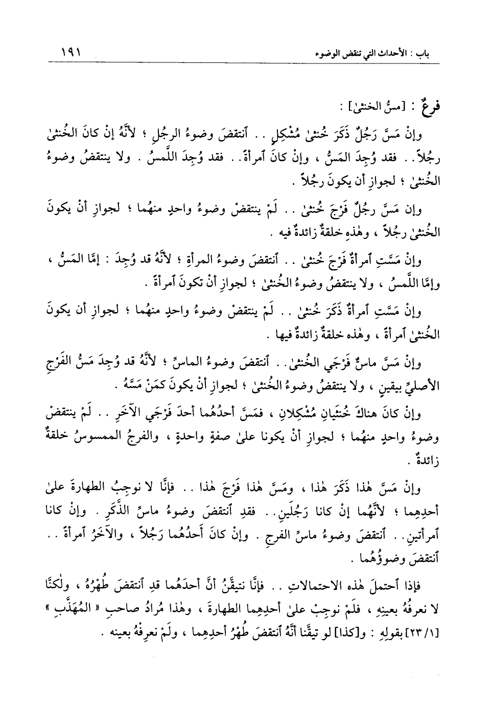 ] : وإن مس رجل ذكر خنثى مشكل انتقض وضوء الرجل؛ لأنه إن كان الخنثى رجلا فقد وجد المس، وإن كان امرأة فقد وجد اللمس. ولا ينتقض وضوء الخنثى؛ لجواز أن يكون رجلا.