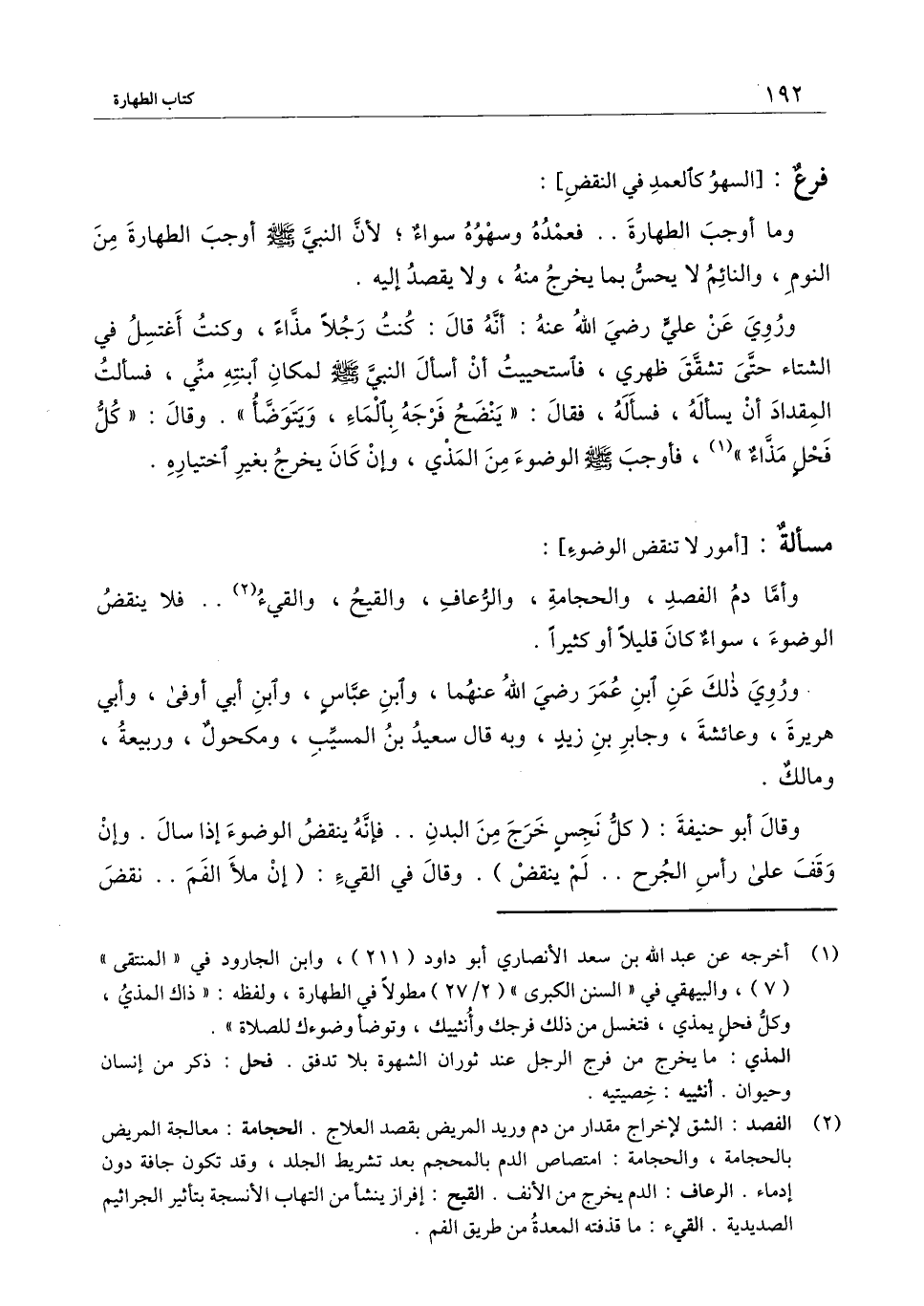 ] : وأما دم الفصد، والحجامة، والرعاف، والقيح، والقيء، فلا ينقض الوضوء، سواء كان قليلا أو كثيرًا.