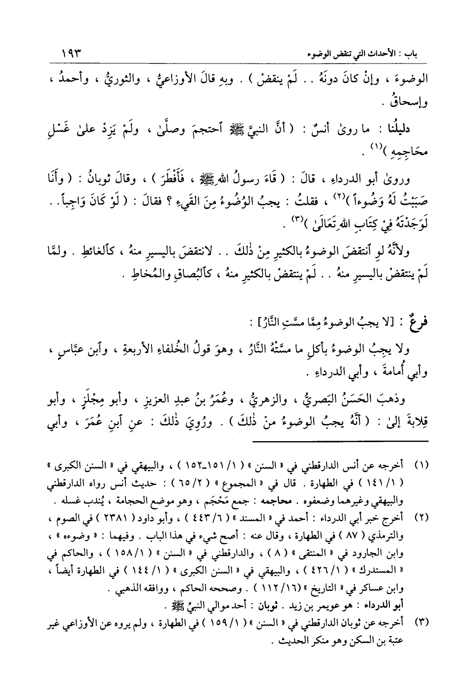 ] : ولا يجب الوضوء بأكل ما مسته النار، وهو قول الخلفاء الأربعة، وابن عباس، وأبي أمامة، وأبي الدرداء.