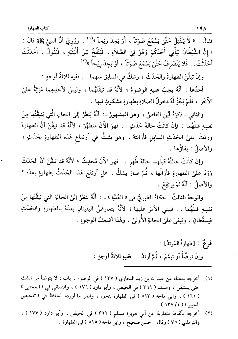 فقال: " لا ينفتل حتى يسمع صوتًا، أو يجد ريحًا» وروي أن النبي - صَلَّى اللَّهُ عَلَيْهِ وَسَلَّمَ - قال: «إن الشيطان ليأتي أحدكم وهو في الصلاة، فينفخ بين أليتيه، فيقول: أحدثت أحدثت، فلا ينصرف حتى يسمع صوتًا، أو يجد ريحًا» .