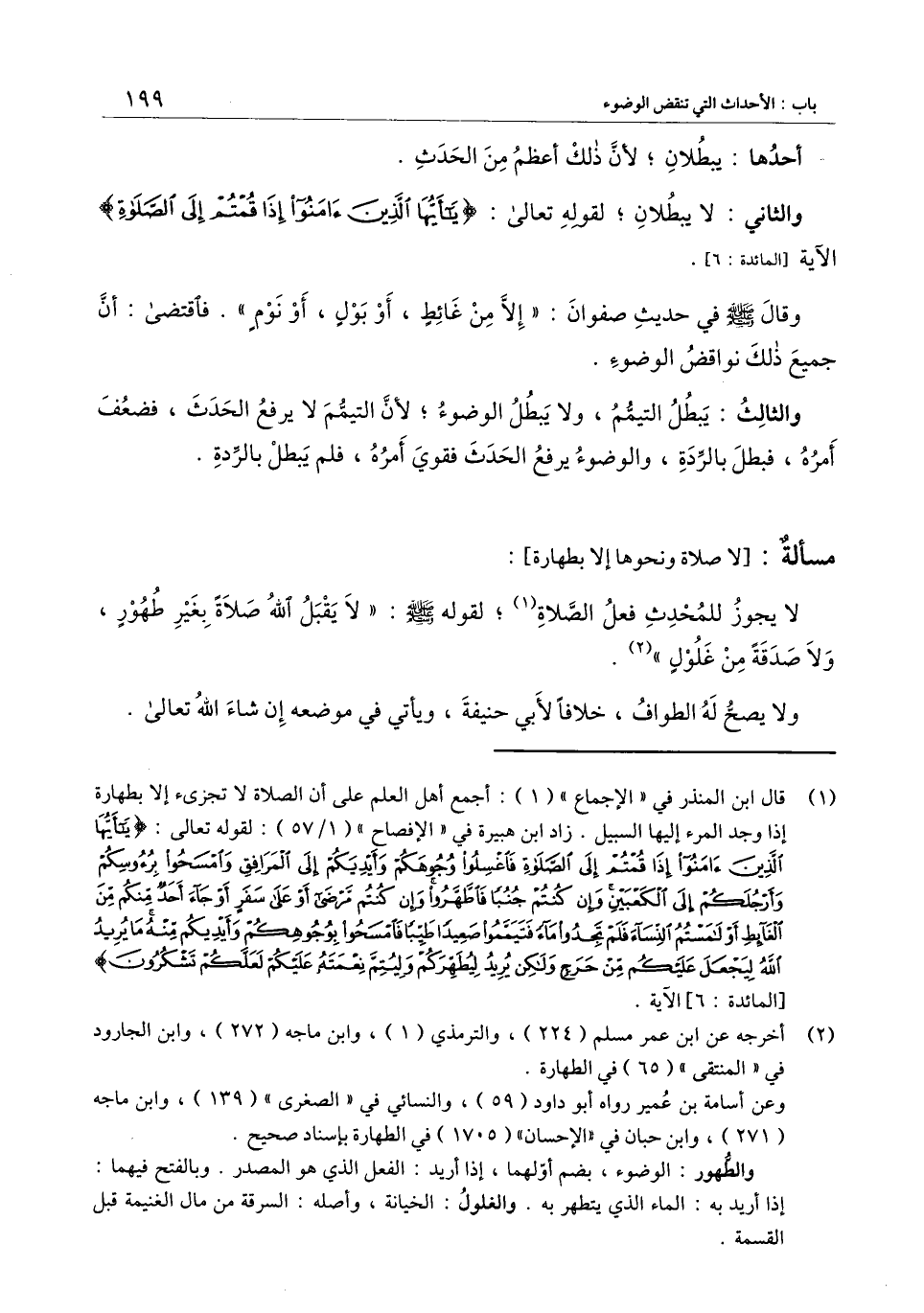 ] : لا يجوز للمحدث فعل الصلاة؛ لقوله - صَلَّى اللَّهُ عَلَيْهِ وَسَلَّمَ - «لا يقبل الله صلاة بغير طهور، ولا صدقة من غلول» .