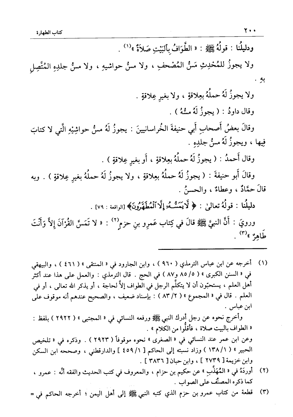 وروي: أن النبي - صَلَّى اللَّهُ عَلَيْهِ وَسَلَّمَ - قال في كتاب عمرو بن حزم: «لا تمس القرآن إلا وأنت طاهر» .