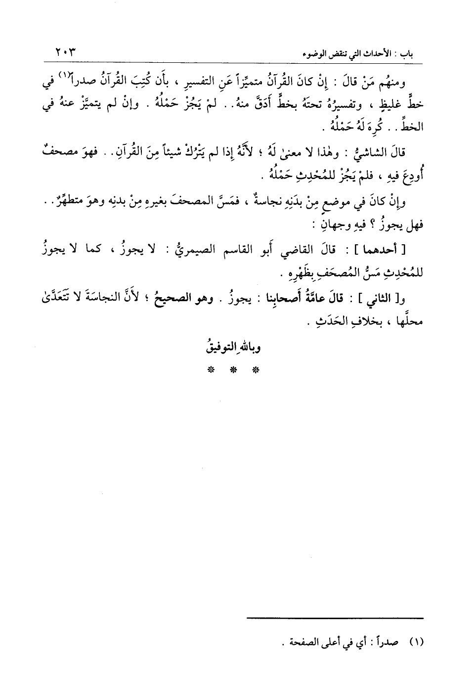 وإن كان في موضع من بدنه نجاسة، فمس المصحف بغيره من بدنه وهو متطهر، فهل يجوز؟ فيه وجهان: