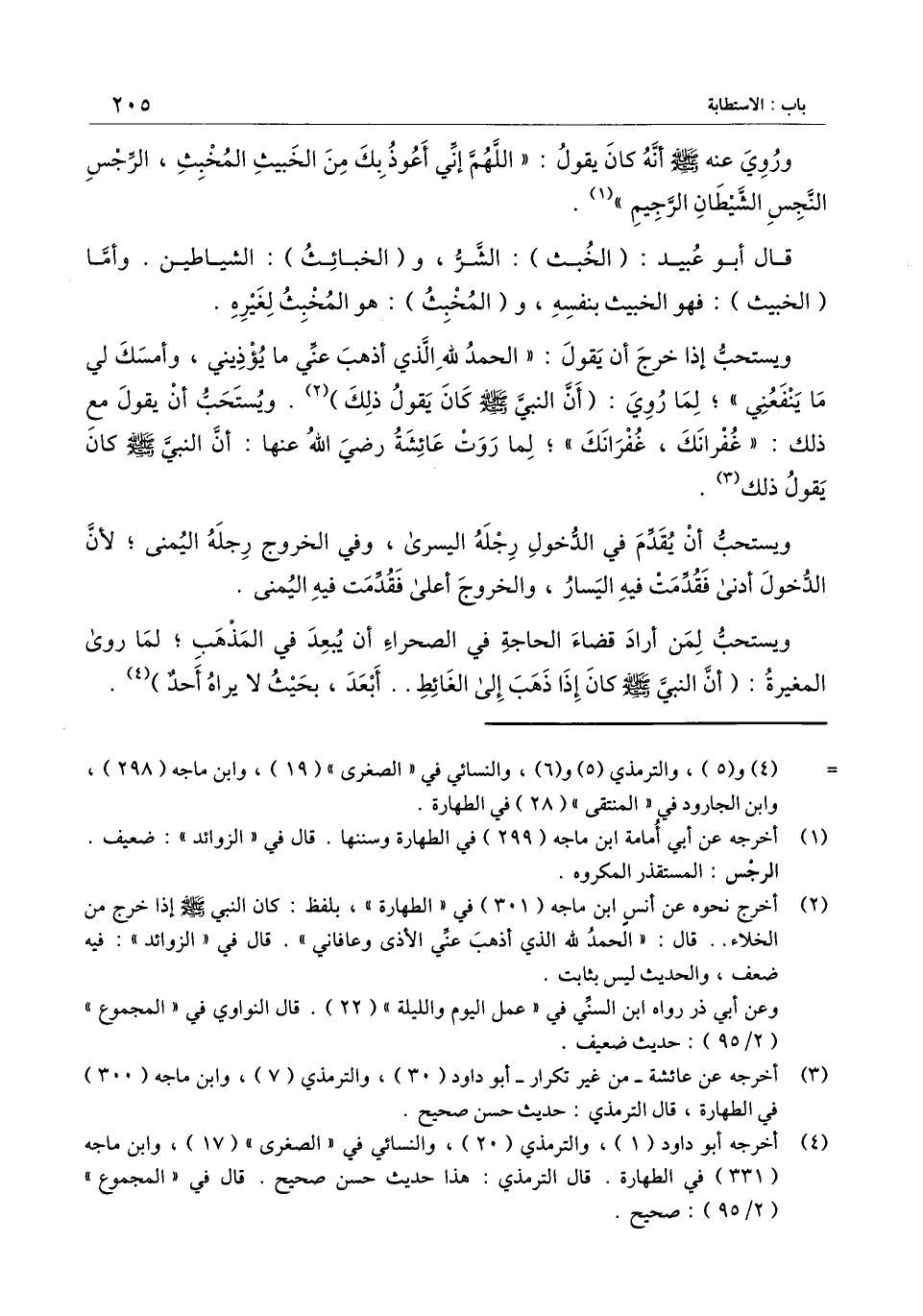 ويستحب إذا خرج أن يقول: «الحمد لله الذي أذهب عني ما يؤذيني، وأمسك لي ما ينفعني» . لما روي: (أن النبي - صَلَّى اللَّهُ عَلَيْهِ وَسَلَّمَ - كان يقول ذلك) . ويستحب أن يقول مع ذلك: «غفرانك، غفرانك» . لما روت عائشة - رَضِيَ اللَّهُ عَنْهَا -: أن النبي - صَلَّى اللَّهُ عَلَيْهِ وَسَلَّمَ - كان يقول ذلك.