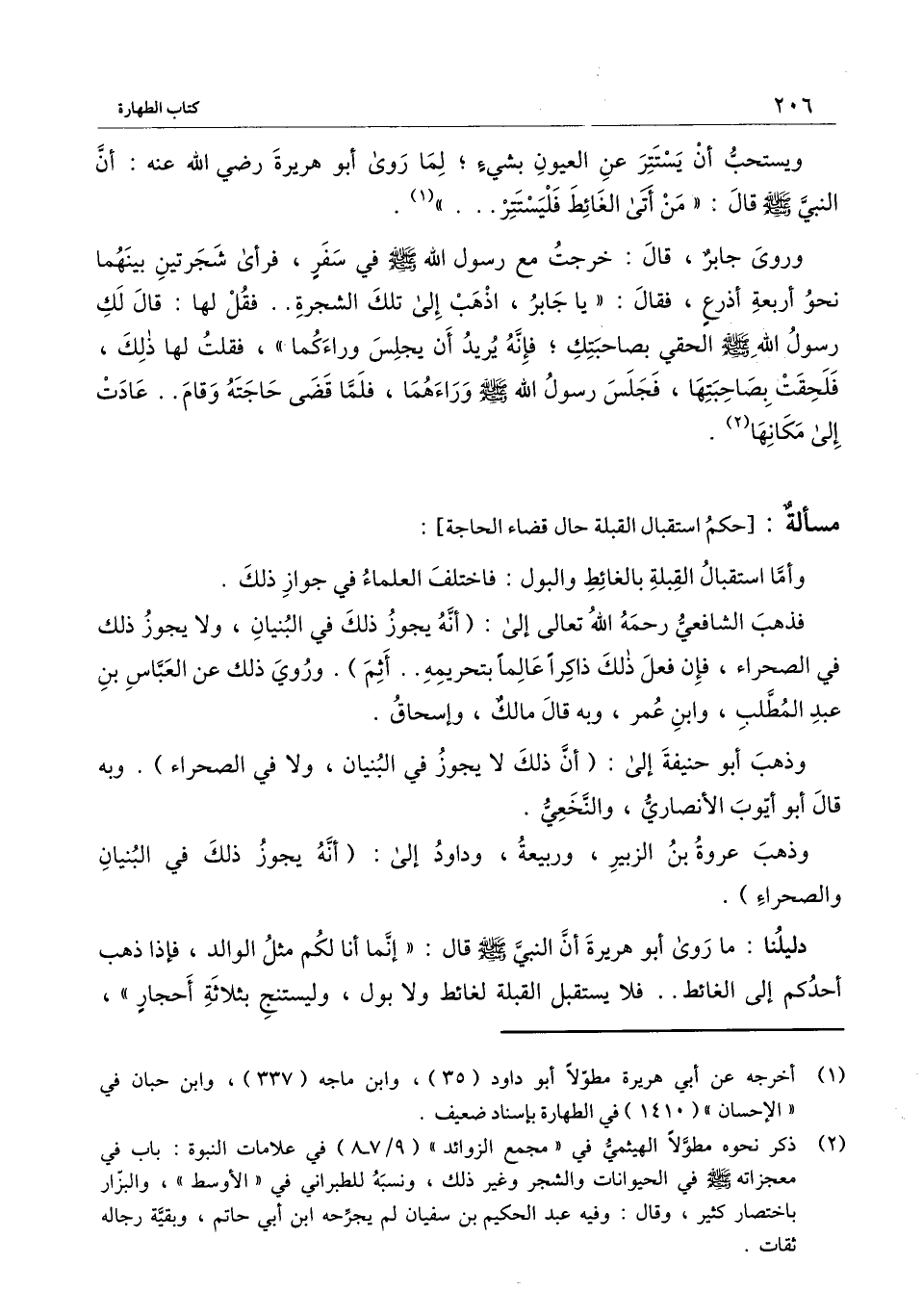 «وروى جابر قال: خرجت مع رسول الله - صَلَّى اللَّهُ عَلَيْهِ وَسَلَّمَ - في سفر، فرأى شجرتين بينهما نحو أربعة أزرع، فقال: " يا جابر، اذهب إلى تلك الشجرة، فقل لها: قال لك رسول الله - صَلَّى اللَّهُ عَلَيْهِ وَسَلَّمَ - الحقي بصاحبتك؛ فإنه يريد أن يجلس وراءكما "، فقلت لها ذلك، فلحقت بصاحبتها، فجلس رسول الله - صَلَّى اللَّهُ عَلَيْهِ وَسَلَّمَ - وراءهما، فلما قضى حاجته وقام، عادت إلى مكانها» .
