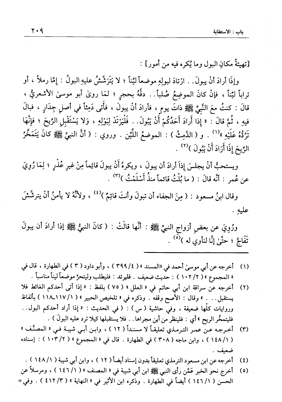 [تهيئة مكان البول وما يكره فيه من أمور] : وإذا أراد أن يبول، ارتاد لبوله موضعا لينا؛ لا يترشش عليه البول: إما رملا، أو ترابا لينا، فإن كان الموضع صلبا، دقه بحجر؛ لما «روى أبو موسى الأشعري، قال: كنت مع النبي - صَلَّى اللَّهُ عَلَيْهِ وَسَلَّمَ - ذات يوم، فأراد أن يبول، فأتى دمثا في أصل جدار، فبال فيه، ثم قال: " إذا أراد أحدكم أن يبول، فليرتد لبوله، ولا يستقبل الريح؛ فإنها ترده عليه» . و (الدمث) : الموضع اللين. وروي: «أن النبي - صَلَّى اللَّهُ عَلَيْهِ وَسَلَّمَ - كان يتمخر الريح إذا أراد أن يبول» .