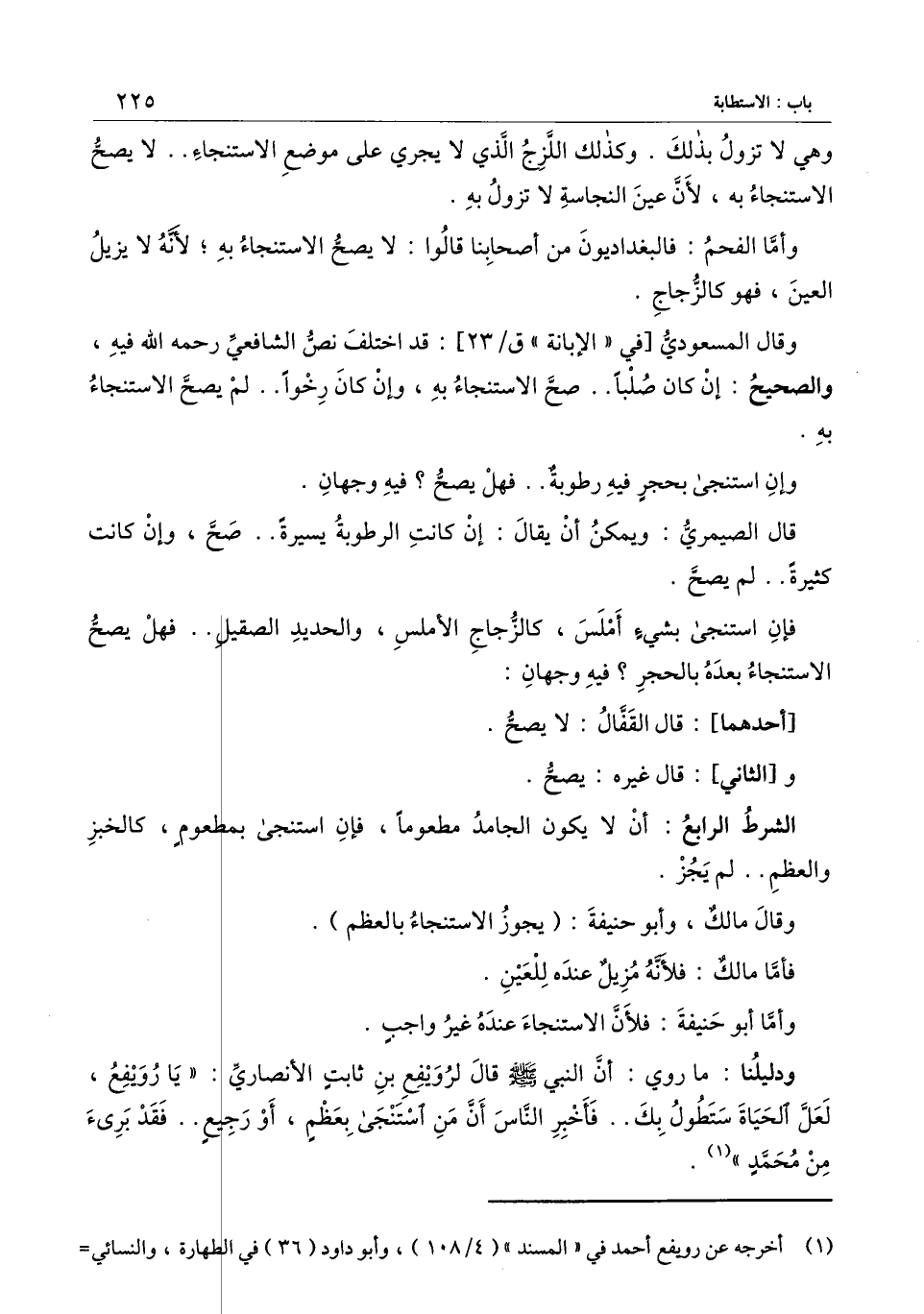 ودليلنا: ما روي: أن النبي - صَلَّى اللَّهُ عَلَيْهِ وَسَلَّمَ - قال لرويفع بن ثابت الأنصاري: «يا رويفع، لعل الحياة ستطول بك، فأخبر الناس أن من استنجى بعظم، أو رجيع فقد برئ من محمد» .