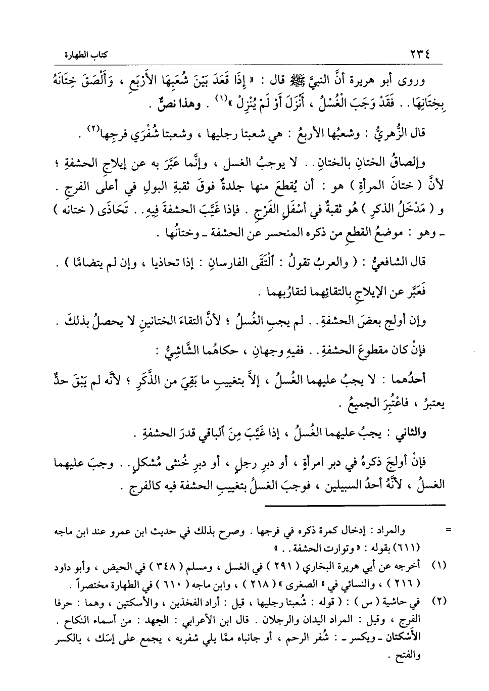 وروى أبو هريرة أن النبي - صَلَّى اللَّهُ عَلَيْهِ وَسَلَّمَ - قال: «إذا قعد بين شعبها الأربع، وألصق ختانه بختانها فقد وجب الغسل، أنزل أو لم ينزل» . وهذه نص.
