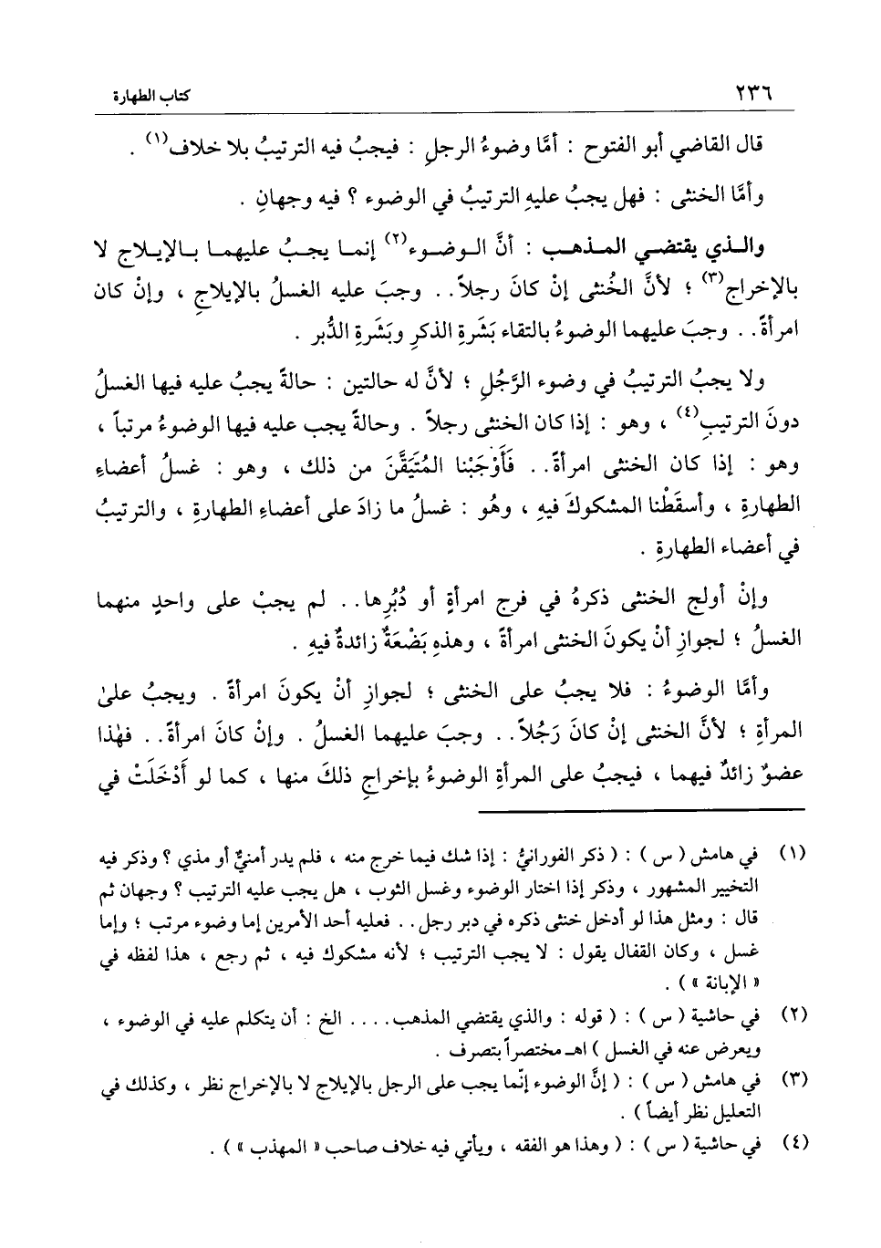 ولا يجب الترتيب في وضوء الرجل؛ لأن له حالتين: حالة يجب عليه فيها الغسل دون الترتيب، وهو: إذا كان الخنثى رجلا. وحالة يجب عليه فيها الوضوء مرتبًا، وهو: إذا كان الخنثى امرأة، فأوجبنا المتيقن من ذلك، وهو: غسل أعضاء الطهارة، وأسقطنا المشكوك فيه، وهو: غسل ما زاد على أعضاء الطهارة، والترتيب في أعضاء الطهارة.