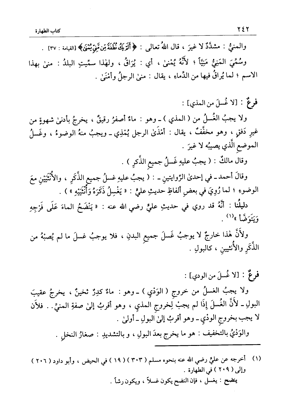 ] : ولا يجب الغسل من المذي) ـ وهو: ماء أصفر رقيق، يخرج بأدنى شهوة من غير دفق، وهو مخفف، يقال: أمذى الرجل يمذي ـ ويجب منه الوضوء، وغسل الموضع الذي يصيبه لا غير.