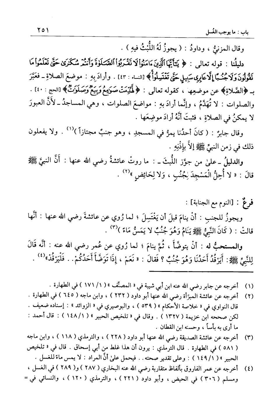 ] : ويجوز للجنب: أن ينام قبل أن يغتسل؛ لما روي عن عائشة - رَضِيَ اللَّهُ عَنْهَا -: أنَّها قالت: «كان النبي - صَلَّى اللَّهُ عَلَيْهِ وَسَلَّمَ - ينام وهو جنبٌ لا يمس ماء» .
