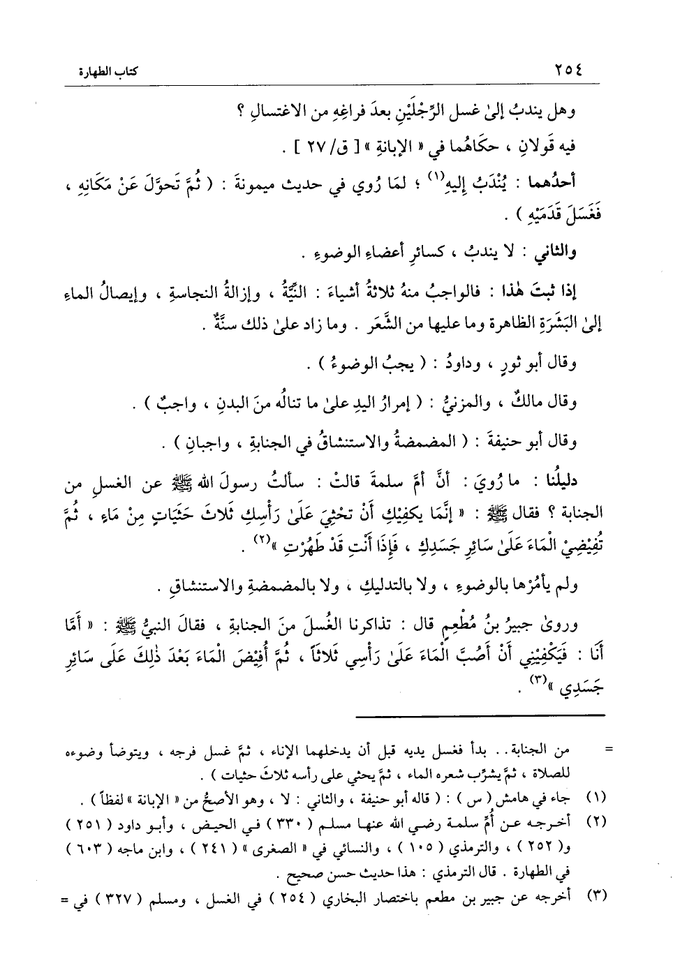 «وروى جبير بن مطعم قال: تذاكرنا الغسل من الجنابة، فقال النبي - صَلَّى اللَّهُ عَلَيْهِ وَسَلَّمَ -: " أما أنا: فيكفيني أن أصب الماء على رأسي ثلاثًا، ثمّ أفيض الماء بعد ذلك على سائر جسدي» .