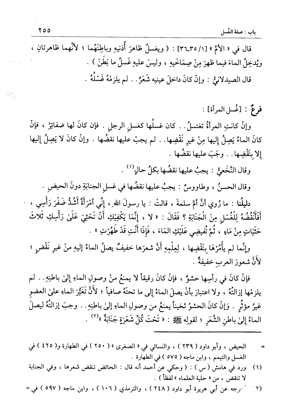 دليلنا: ما روي «أنّ أم سلمة، قالت: يا رسول الله، إني امرأة أشد ضفر رأسي، أفأنقضه للغسل من الجنابة؟ فقال: " لا، إنما يكفيك أن تحثي على رأسك ثلاث حثياتٍ من ماءٍ، ثمّ تفيضي عليك الماء، فإذا أنت قد طهرت» .