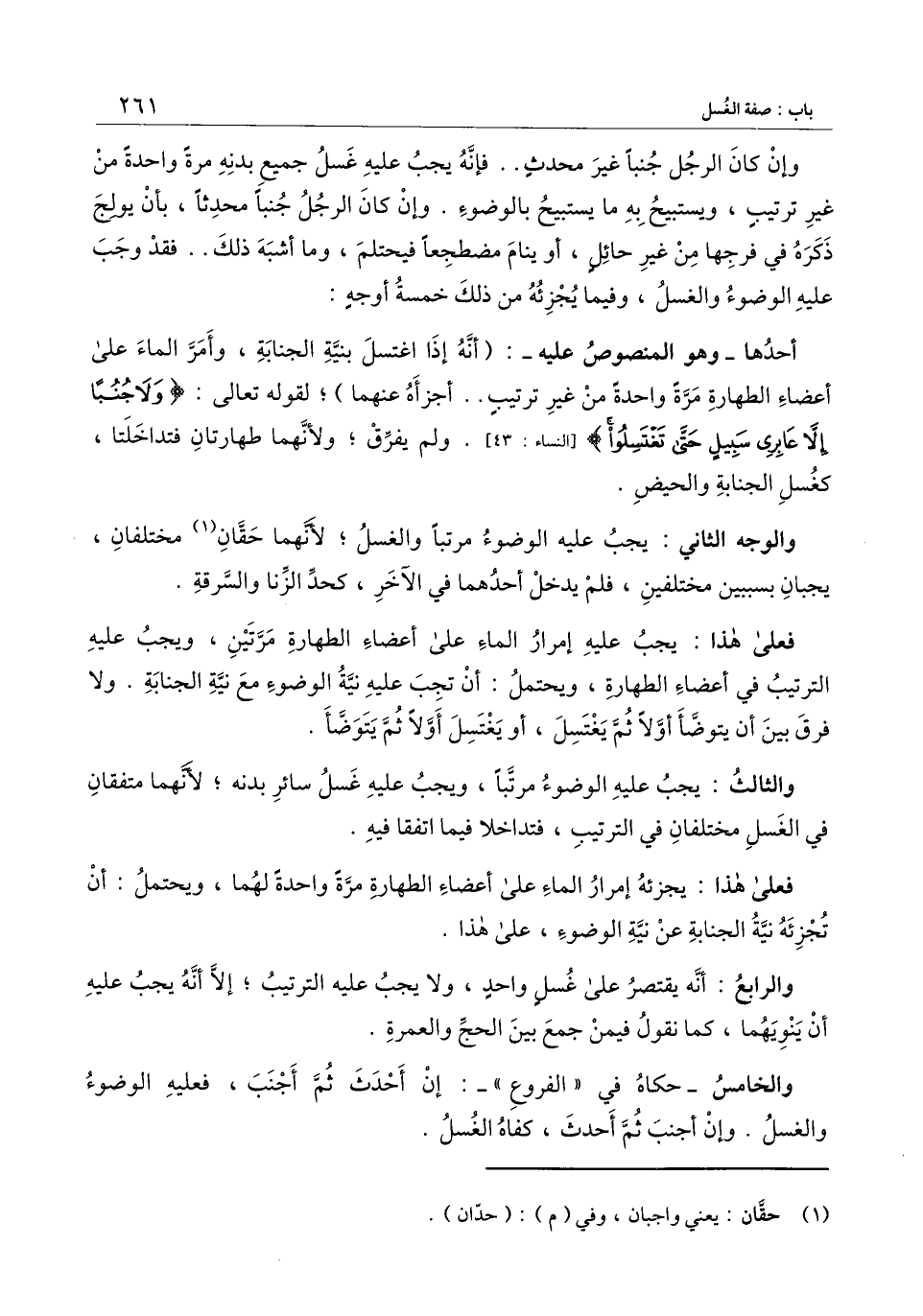 وإن كان الرجل جنبًا غير محدثٍ.. فإنه يجب عليه غسل جميع بدنه مرةً واحدةً من غير ترتيب، ويستبيح به ما يستبيح بالوضوء. وإن كان الرجل جنبًا محدثًا، بأن يولج ذكره في فرجها من غير حائل، أو ينام مضطجعًا فيحتلم، وما أشبه ذلك.. فقد وجب عليه الوضوء والغسل، وفيما يجزئه من ذلك من خمسة أوجهٍ: