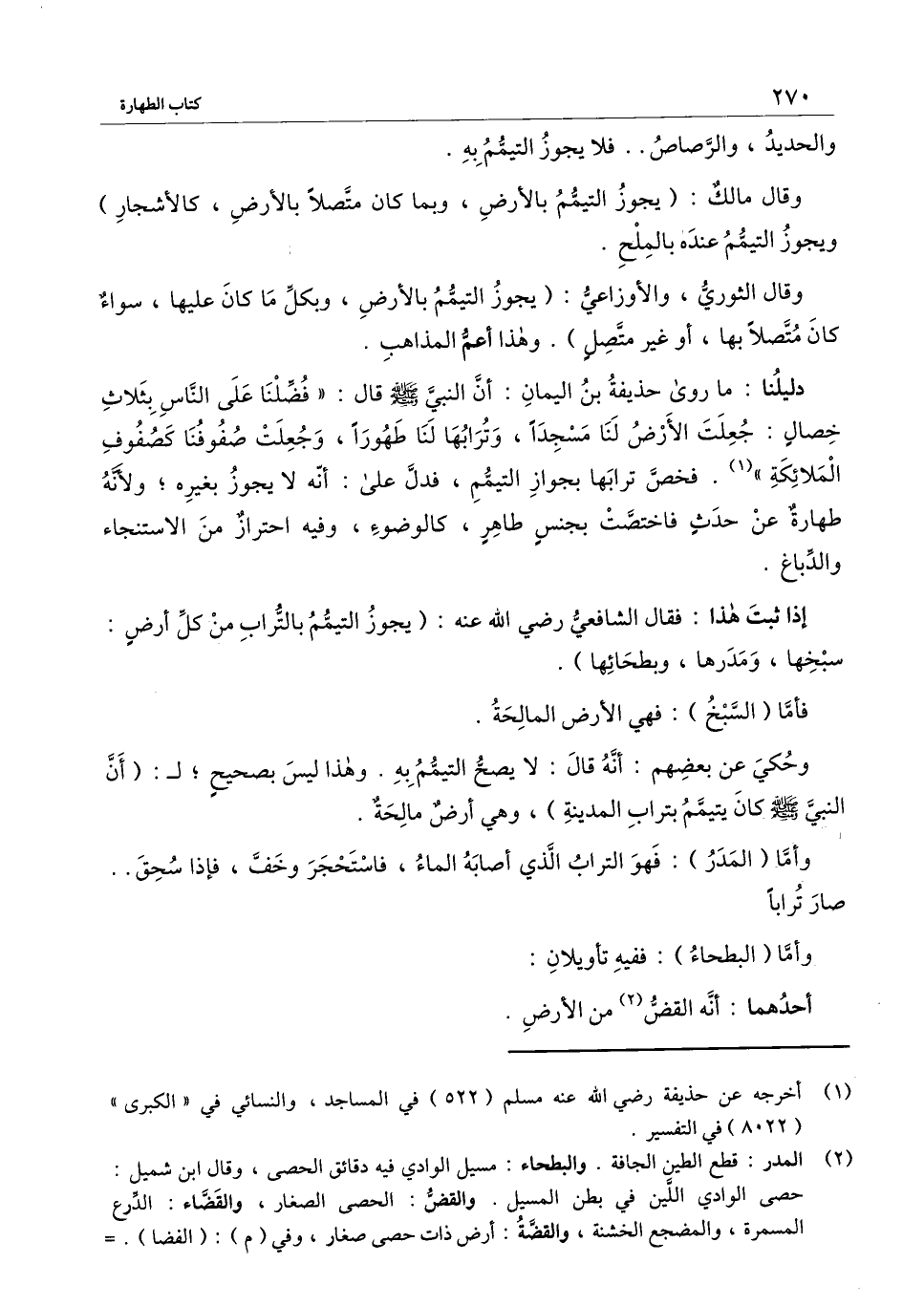 وحكي عن بعضهم: أنه قال: لا يصح التيمّم به. وهذا ليس بصحيح؛ لـ: «أنّ النبي - صَلَّى اللَّهُ عَلَيْهِ وَسَلَّمَ - كان يتيمّم بتراب المدينة» ، وهي أرضٌ مالحةٌ.