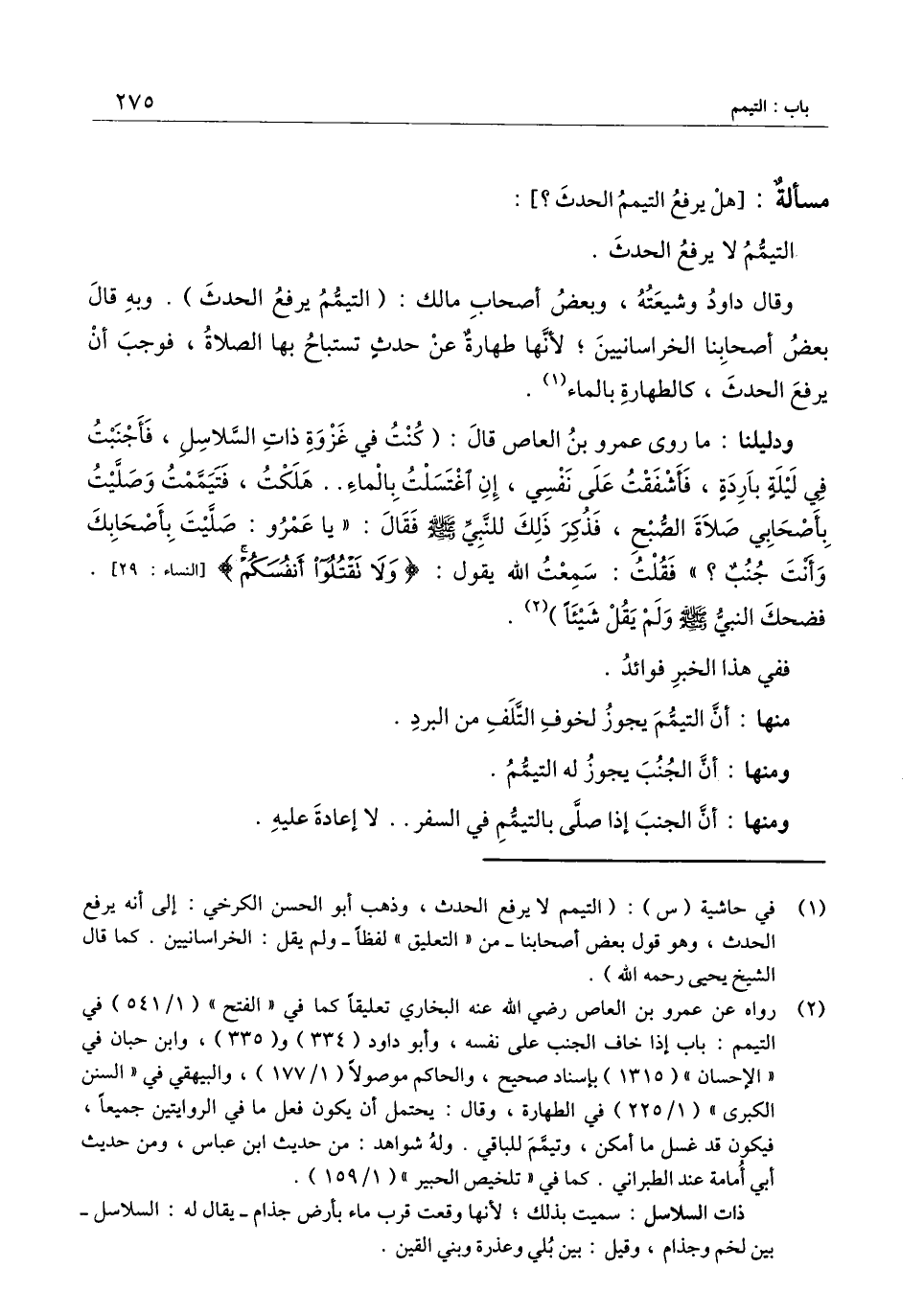 ودليلنا: ما «روى عمرو بن العاص قال: (كنت في غزوة ذات السّلاسل، فأجنبت في ليلةٍ باردةٍ، فأشفقت على نفسي، إن اغتسلت بالماء.. هلكت، فتيمّمت وصليت بأصحابي صلاة الصبح، فذكر ذلك للنبي - صَلَّى اللَّهُ عَلَيْهِ وَسَلَّمَ - فقال: "يا عمرو: صلّيت بأصحابك وأنت جنبٌ؟ " فقلت: سمعت الله يقول: {وَلا تَقْتُلُوا أَنْفُسَكُمْ} [النساء: 29] [النساء: 29] . فضحك النبي - صَلَّى اللَّهُ عَلَيْهِ وَسَلَّمَ - ولم يقل شيئًا» .