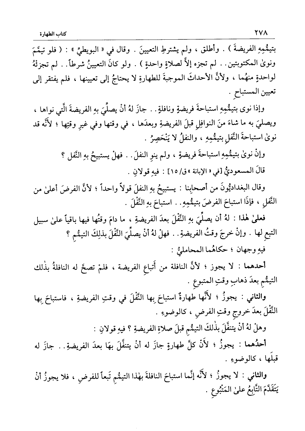 وإذا نوى بتيمّمه استباحة فريضةٍ ونافلةٍ.. جاز له أن يصلي به الفريضة التي نواها، ويصلي به ما شاء من النوافل قبل الفريضة وبعدها، في وقتها وفي غير وقتها؛ لأنه قد نوى استباحة النّفل بتيمّمه، والنفل لا ينحصر.