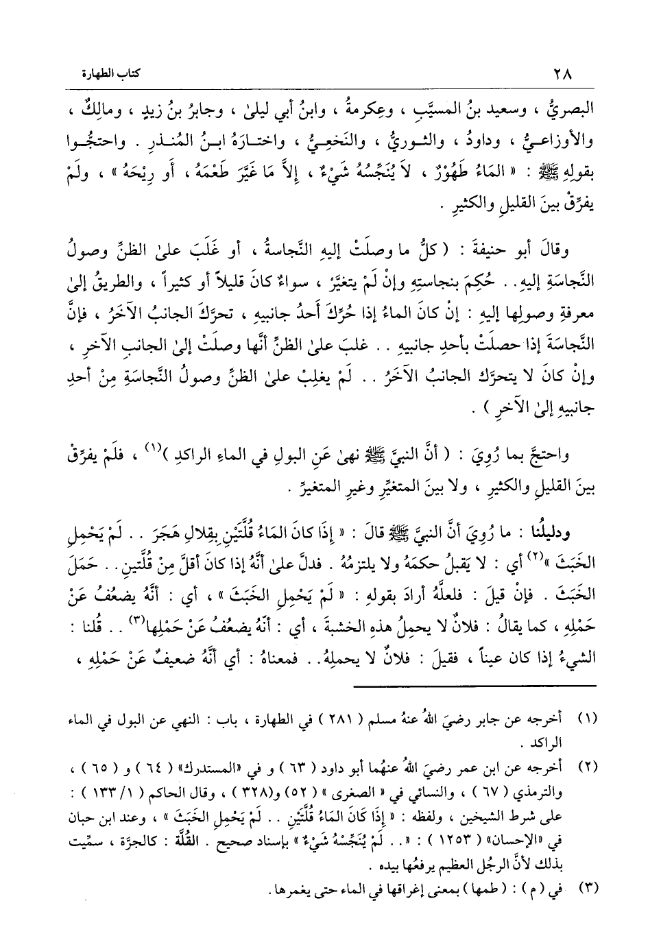 ودليلنا: ما روي أن النبي - صَلَّى اللَّهُ عَلَيْهِ وَسَلَّمَ - قال: «إذا كان الماء قلتين بقلال هجر.. لم يحمل الخبث» أي: لا يقبل حكمه ولا يلتزمه. فدل على أنه إذا كان أقل من قلتين.. حمل الخبث. فإن قيل: فلعله أراد بقوله: " لم يحمل الخبث "، أي: أنه يضعف عن حمله، كما يقال: فلان لا يحمل هذه الخشبة، أي: أنه يضعف عن حملها.. قلنا: الشيء إذا كان عينًا، فقيل: فلان لا يحمله.. فمعناه: أي أنه ضعيف عن حمله،