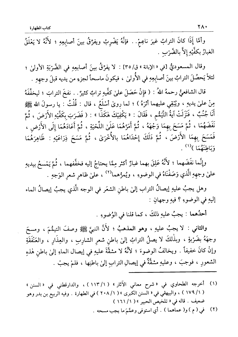 قال الشافعي - رَحِمَهُ اللَّهُ -: (فإن حصل على كفّيه تراب كثير.. نفخ التراب؛ ليخففه من على يديه، ويبقي عليهما أثره) ؛ لما «روى أسلع، قال: قلت: يا رسول الله - صَلَّى اللَّهُ عَلَيْهِ وَسَلَّمَ - أنا جنب، فنزلت آية التيمّم، فقال: "يكفيك هكذا": (فضرب بكفيه الأرض، ثمّ نفضهما، ثمّ مسح بهما وجهه، ثمّ أمرهما على اللحية، ثمّ أعادهما إلى الأرض، فمسح بهما الأرض، ثمّ دلك إحداهما بالأخرى، ثمّ مسح ذراعيه: ظاهرهما وباطنهما» .