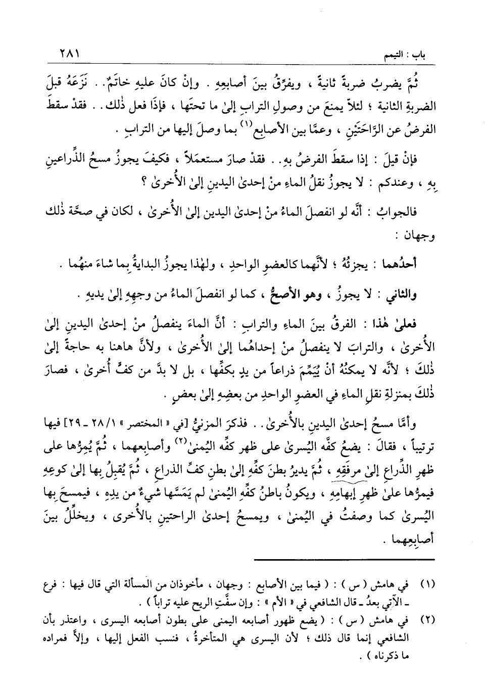 وأما مسح إحدى اليدين بالأخرى.. فذكر المزني [في " المختصر " 1/28-29] فيها ترتيبا، فقال: يضع كفه اليسرى على ظهر كفه اليمنى وأصابعهما، ثم يمرها على ظهر الذراع إلى مرفقه، ثم يدير بطن كفه إلى بطن كف الذراع، ثم يقبل بها إلى كوعه فيمرها على ظهر إبهامه، ويكون باطن كفه اليمنى لم يمسها شيء من يده، فيمسح بها اليسرى كما وصفت في اليمنى، ويمسح إحدى الراحتين بالأخرى، وخلل بين أصابعهما.