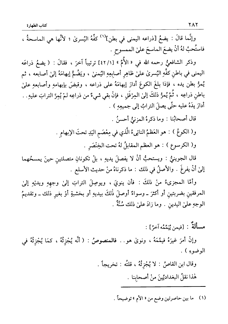وذكر الشافعي - رَحِمَهُ اللَّهُ - في " الأم " [1/42] ترتيبا آخر، فقال: (يضع ذراعه اليمنى في باطن كفه اليسرى على ظاهر أصابعه اليمنى، ويضم إبهامه إلى أصابعه، ثم يمر بطن يده، فإذا بلغ الكوع أدار إبهامه على ذراعه، وقبض بإبهامه وأصابعه على باطن ذراعه، ثم يمر ذلك إلى المرفق، فإن بقي شيء من ذراعه لم يمر التراب عليه.. أدار يده عليه حتى يصل التراب إلى جميعه) .