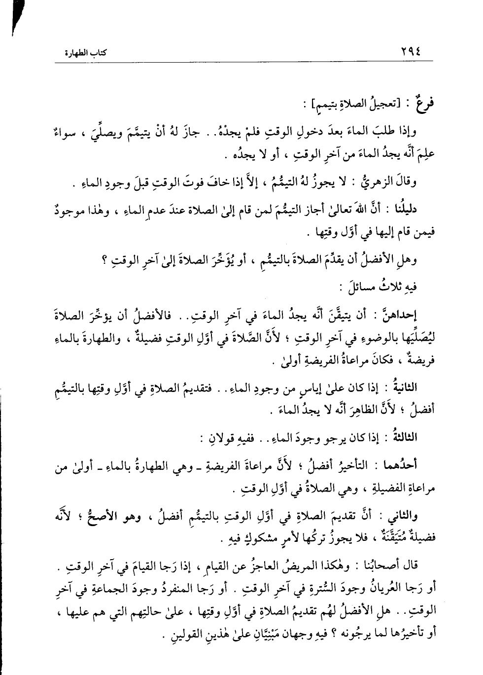إحداهن: أن يتيقن أنه يجد الماء في آخر الوقت.. فالأفضل أن يؤخر الصلاة ليصليها بالوضوء في آخر الوقت؛ لأن الصلاة في أول الوقت فضيلة، والطهارة بالماء فريضة، فكان مراعاة الفريضة أولى.