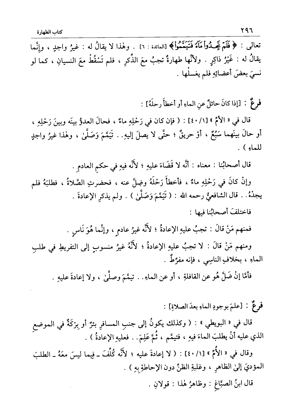 ] : قال في " البويطي ": (وكذلك يكون إلى جنب المسافر بئر أو بركة في الموضع الذي عليه أن يطلب الماء فيه، فتيمم، ثم علم.. فعليه الإعادة) .