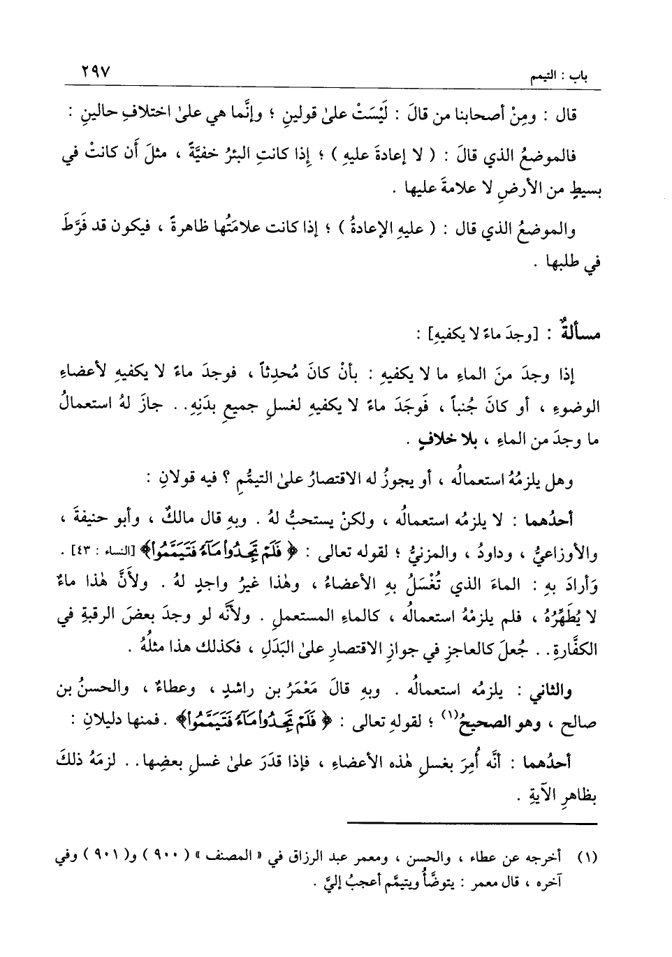 أحدهما: لا يلزمه استعماله، ولكن يستحب له. وبه قال مالك، وأبو حنيفة، والأوزاعي، وداود، والمزني؛ لِقَوْلِهِ تَعَالَى: {فَلَمْ تَجِدُوا مَاءً فَتَيَمَّمُوا} [النساء: 43] [النساء: 43] . وأراد به: الماء الذي تغسل به الأعضاء، وهذا غير واجد له. ولأن هذا ماء لا يطهره، فلم يلزمه استعماله، كالماء المستعمل. ولأنه لو وجد بعض الرقبة في الكفارة.. جعل كالعاجز في جواز الاقتصار على البدل، فكذلك هذا مثله.