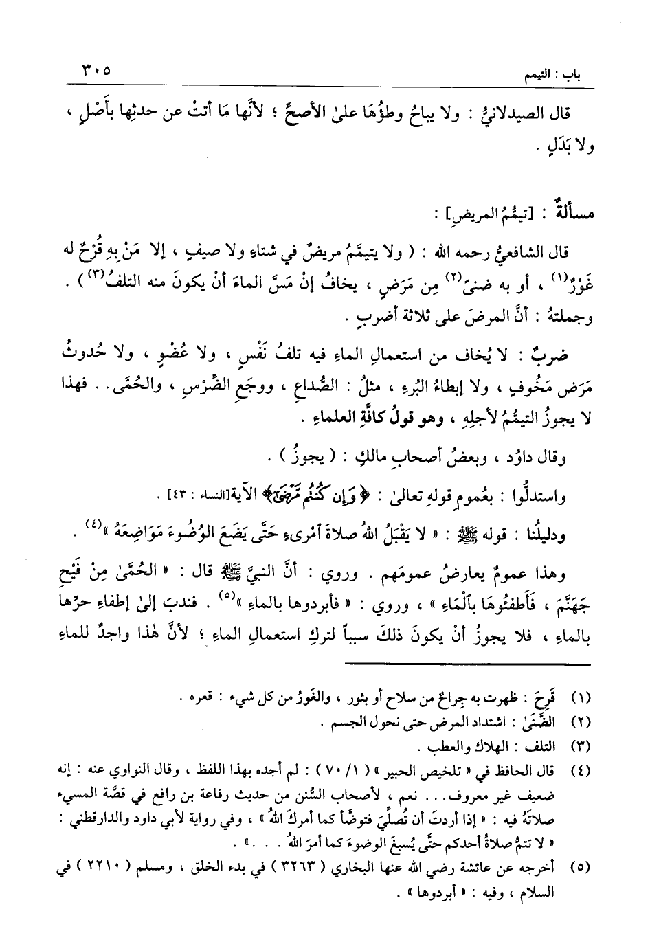 قال الشافعي - رَحِمَهُ اللَّهُ -: (ولا يتيمم مريض في شتاء ولا صيف، إلا من به قرح له غور، أو به ضنى من مرض، يخاف إن مس الماء أن يكون منه التلف) . وجملته: أن المرض على ثلاثة أضرب.