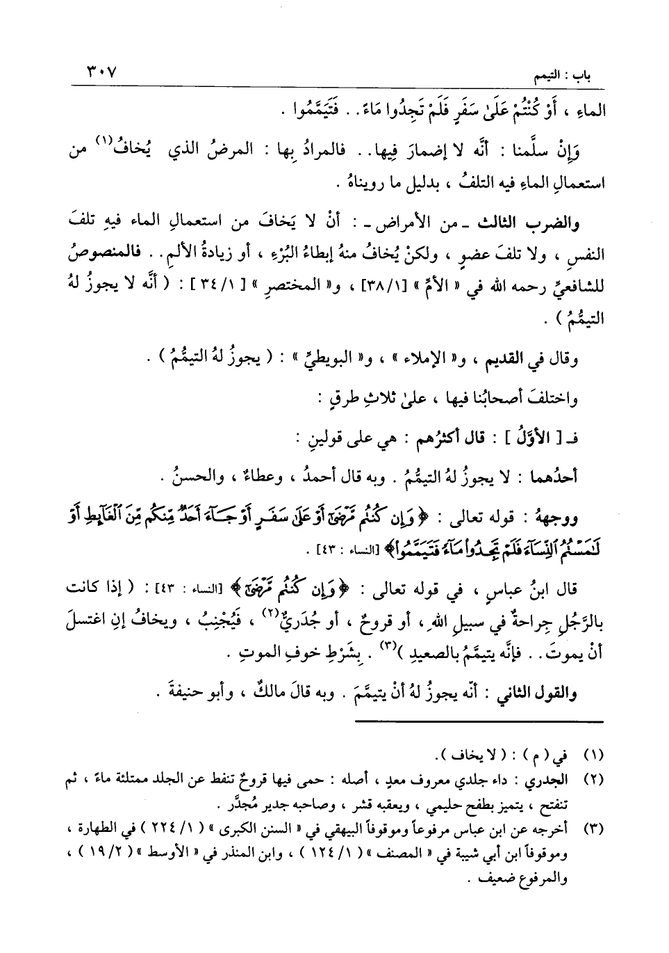 والضرب الثالث: ـ من الأمراض ـ: أن لا يخاف من استعمال الماء فيه تلف النفس، ولا تلف عضو، ولكن يخاف منه إبطاء البرء، أو زيادة الألم.. فالمنصوص للشافعي - رَحِمَهُ اللَّهُ - في " الأم " [1/38] ، و" المختصر " [1/34] : (أنه لا يجوز له التيمم) .