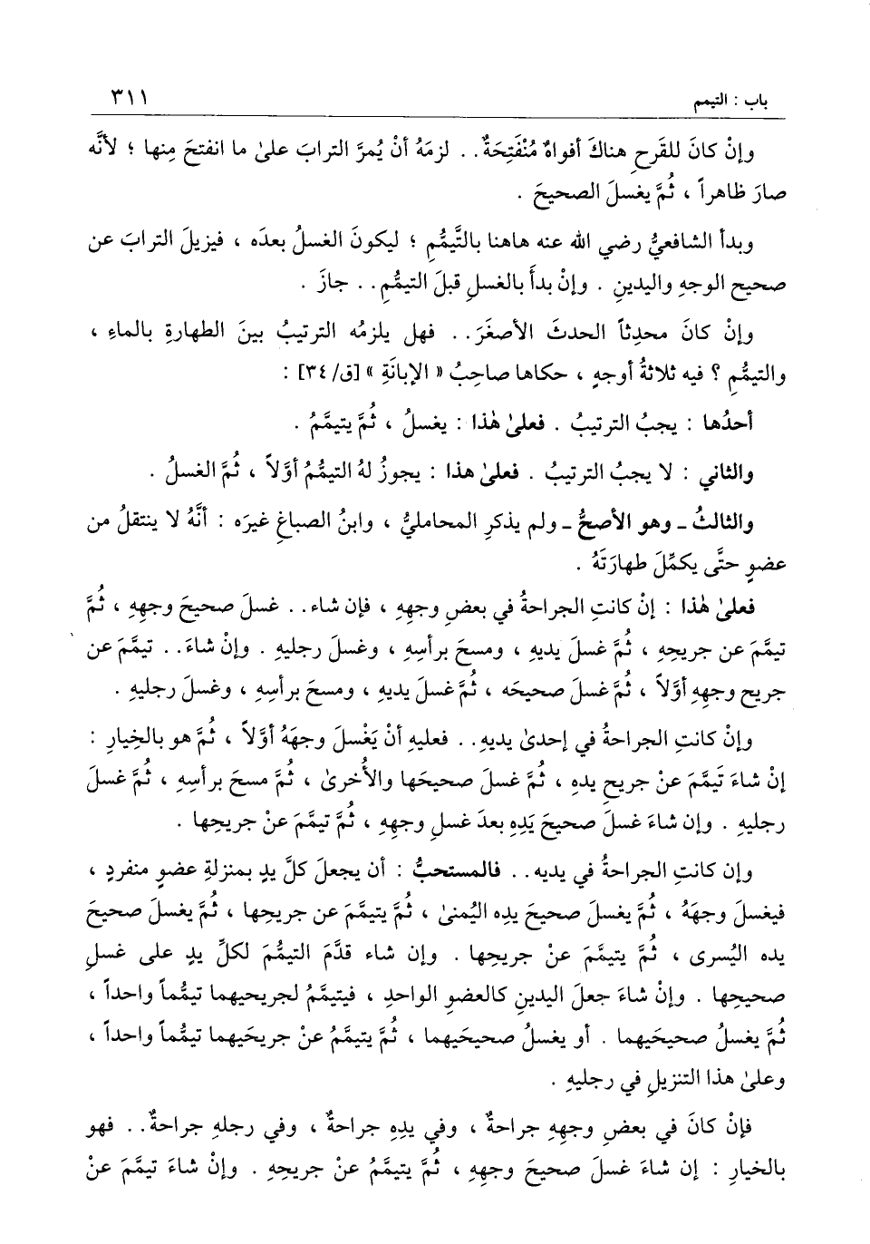 وإن كانت الجراحة في إحدى يديه.. فعليه أن يغسل وجهه أولاً، ثم هو بالخيار: إن شاء تيمم عن جريح يده، ثم غسل صحيحها والأخرى، ثم مسح برأسه، ثم غسل رجليه. وإن شاء غسل صحيح يده بعد غسل وجهه، ثم تيمم عن جريحها.