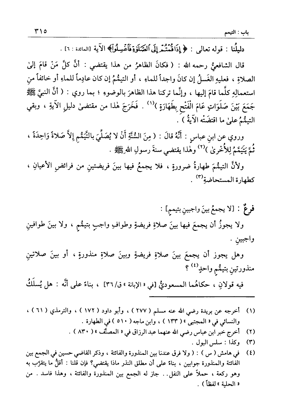 قال الشافعي - رَحِمَهُ اللَّهُ -: (فكان الظاهر من هذا يقتضي: أن كل من قام إلى الصلاة، فعليه الغسل إن كان واجدًا للماء، أو التيمم إن كان عادمًا للماء أو خائفًا من استعماله كلما قام إليه، وإنما تركنا هذا الظاهر بالوضوء؛ بما روي: «أن النبي - صَلَّى اللَّهُ عَلَيْهِ وَسَلَّمَ - جمع بين صلوات عام الفتح بطهارة» . فخرج هذا من مقتضى دليل الآية، وبقي التيمم على ما اقتضته الآية) .