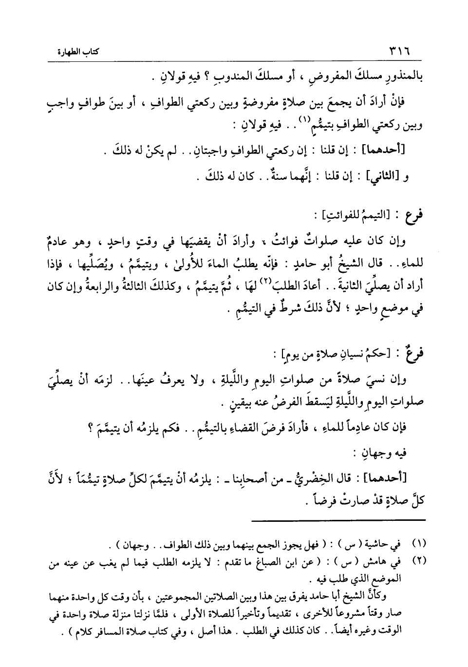 فإن أراد أن يجمع بين صلاة مفروضة وبين ركعتي الطواف، أو بين طوافٍ واجبٍ وبين ركعتي الطواف بتيمم.. فيه قولان: