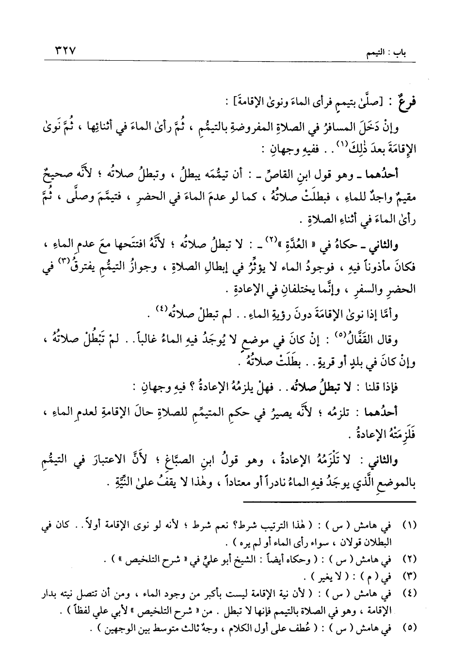 وإن دخل المسافر في الصلاة المفروضة بالتيمم، ثم رأى الماء في أثنائها، ثم نوى الإقامة بعد ذلك.. ففيه وجهان: