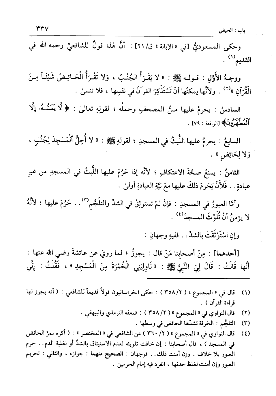 السابع: يحرم عليها اللبث في المسجد؛ لقوله - صَلَّى اللَّهُ عَلَيْهِ وَسَلَّمَ -: «لا أحل المسجد لجنب ولا لحائض» .