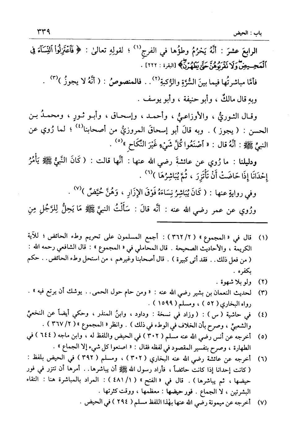 وفي رواية عنها: «كان يباشر نساءه فوق الإزار، وهن حيض» .