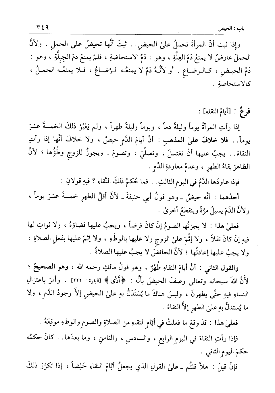 والقول الثاني: أن أيام النقاء طهر، وهو قول مالك - رَحِمَهُ اللَّهُ -، وهو صحيح؛ لأن الله سبحانه وتعالى وصف الحيض بأنه: أذى [البقرة: 222] . وأمر باعتزال النساء فيه حتى يطهرن، وليس هناك ما يستدل به على الحيض إلا وجود الدم، ولا ما يستدل به على الطهر إلا النقاء.